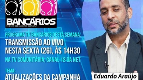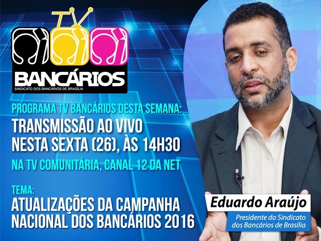 Na edição do Programa TV Bancários desta semana, o estúdio da TV Comunitária de Brasília (Canal 12 da NET) recebe nesta sexta-feira (26) o presidente do Sindicato, Eduardo Araújo, para atualizar a categoria e a população sobre a Campanha Nacional dos Bancários 2016.