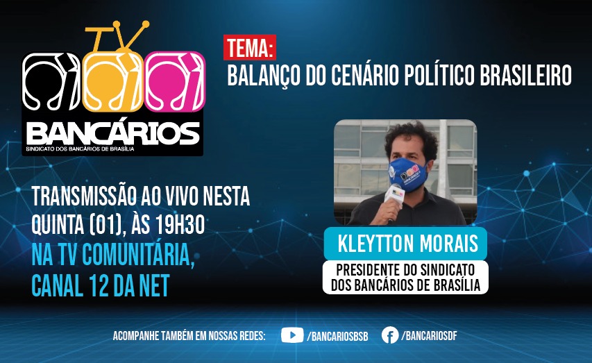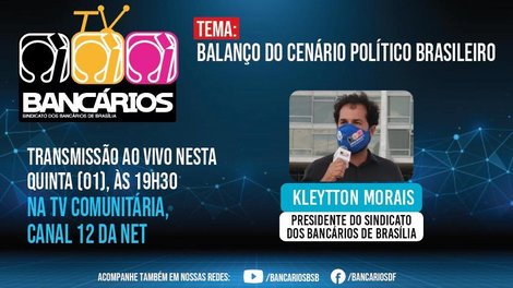 A TV Bancários começa às 19h30, com transmissão pela TV Comunitária no canal 12 da Net e pelo facebook.com/bancariosdf e youtube.com/bancariosbsb do Sindicato.
