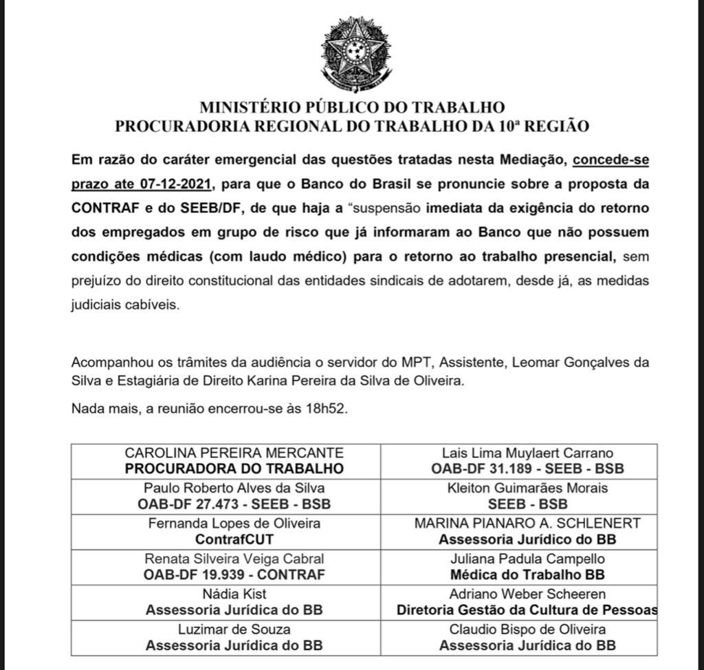 A Comissão de Empresa dos Funcionários do Banco do Brasil (CEBB) se reuniu com o banco na tarde desta terça-feira (7) para debater o retorno ao trabalho presencial do grupo de risco. Por força de ação do Sindicato, que conseguiu do BB compromisso em audiência de mediação no Ministério Público do Trabalho, requerida pela entidade sindical, o banco tinha prazo até esta terça para dar uma resposta sobre as demandas dos representantes dos trabalhadores referentes à manutenção do grupo de risco em home office.