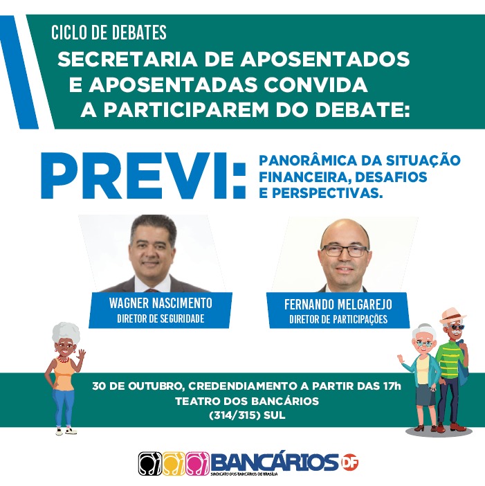 Dando sequência ao ciclo de debates com as bancárias e os bancários aposentados, a Secretaria de Aposentados do Sindicato realiza no próximo encontro, na segunda-feira, dia 30, discussão sobre assuntos relacionados à Caixa de Previdência dos Funcionários do Banco do Brasil, a Previ. A atividade, que será realizada no Teatro dos Bancários (EQS 314/15 - Asa Sul), é aberta também aos trabalhadores da ativa e tem início a partir das 17h, com o credenciamento.