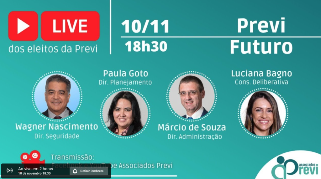 Participam da live Wagner Nascimento, diretor de Seguridade; Paula Goto, diretora de Planejamento; Márcio de Souza, diretor de Administração; e Luciana Bagno, conselheira Deliberativa.