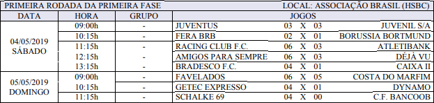 A próxima rodada está marcada para os dias 11, 18 e 19 de maio, quando as equipes Schalke 69 x Juventus; Getec Expresso x Favelados; Fera Brb x Amigos Para Sempre; Racing Club F.C. x Bradesco F.C.; Caixa II x Atletibank; Juvenil S/A x C.F. Bancoob; Déjà Vu x Borussia Bortmund; Costa Do Marfim x Dynamo se enfrentam em campo, respectivamente.