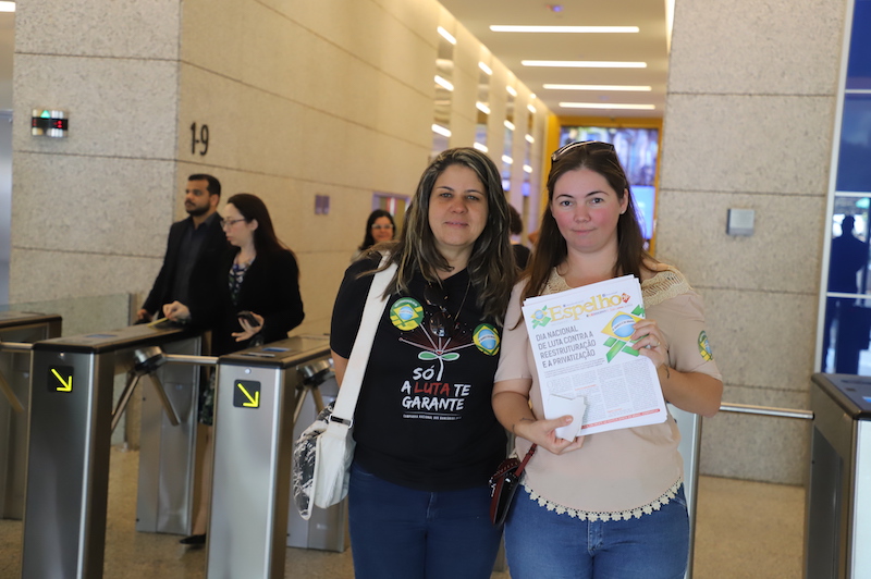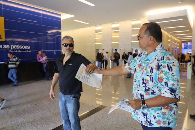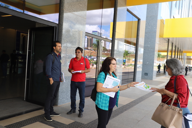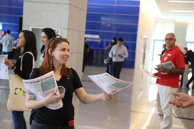 Os bancários e bancárias do Banco do Brasil realizaram nesta sexta-feira (9) mais um Dia Nacional de Luta contra o processo de reestruturação em curso e contra as ameaças de privatização da empresa. Em Brasília, o ato se concentrou no Edifício Banco do Brasil, na Asa Norte, com distribuição do Informativo Espelho e diálogo com os trabalhadores do prédio.