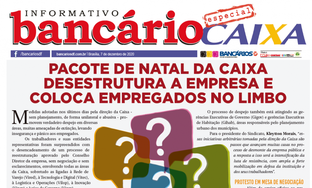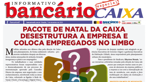 Outros destaques desta edição são: 'Mudanças nas metas prejudicam avaliação e tensionam empregados'; 'Extinção da MP 995 fortalece o combate à privatização da Caixa'; 'Combate a descomissionamento arbitrário será ostensivo'; e 'Alimentos arrecadados em campanha solidária da entidade são entregues a instituições sociais no DF'.