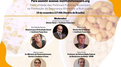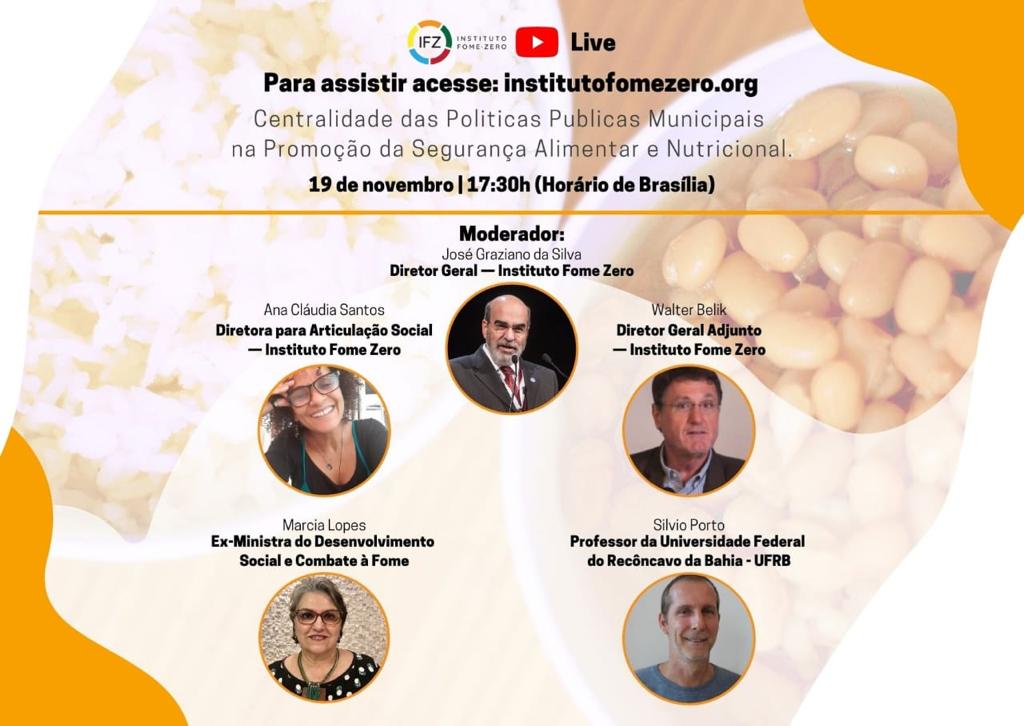 O Instituto Fome Zero (IFZ) realiza uma live com o tema ‘Centralidade das Políticas Públicas Municipais na Promoção da Segurança Alimentar e Nutricional’ nesta quinta-feira (19), às 17h30. O debate terá como moderador José Graziano da Silva, diretor-geral do Instituto Fome Zero.