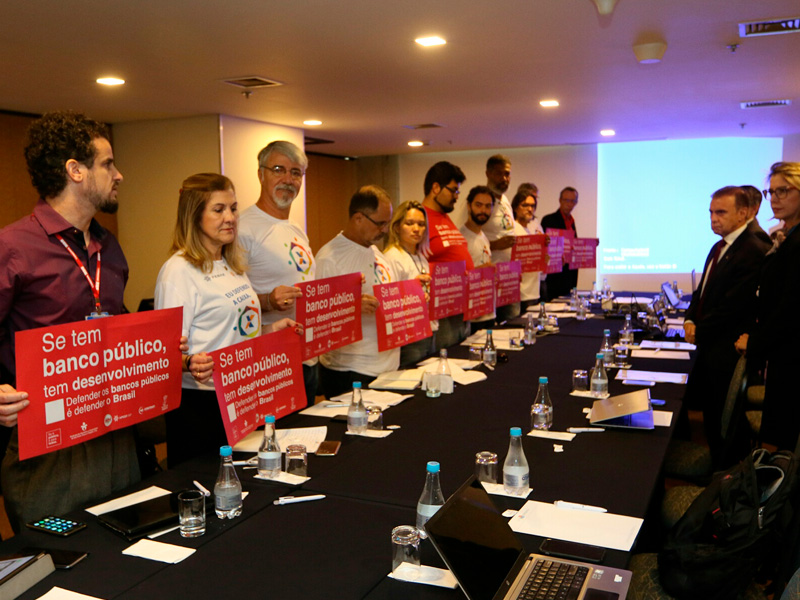Com camisetas da campanha “Defenda a Caixa você também” e de posse de cartazes com os dizeres “Se tem banco público, tem desenvolvimento”, os integrantes da Comissão, que assessora a Confederação Nacional dos Trabalhadores do Ramo Financeiro (Contraf-CUT) nas negociações, deixaram bem claro que vão se manter firmes na luta contra a intenção do governo de abrir o capital da Caixa.