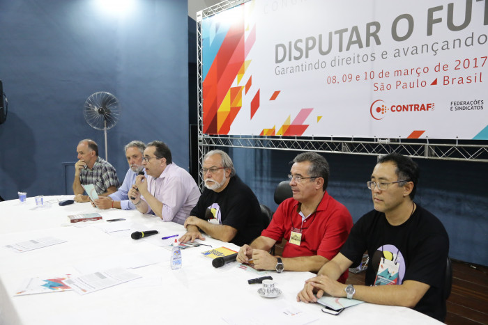 “Golpe de 2016 e a Reforma da Previdência”, conta com textos de diversos autores e tem o apoio da Contraf- CUT e também da Fenae. A publicação foi apresentada durante o Congresso por Wilson Ramos Filho e Nilo Beiro. Os advogados destacaram que a reforma da previdência não estaria em pauta sem o golpe e que não podem ser analisados separadamente.