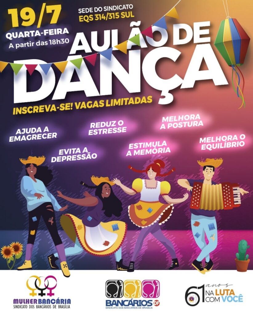 Prepara o look junino, alonga e vem aproveitar o aulão de dança no Sindicato. Na próxima quarta-feira (19), às 18h30, a entidade promove a terceira edição da aula de dança com vagas limitadas.