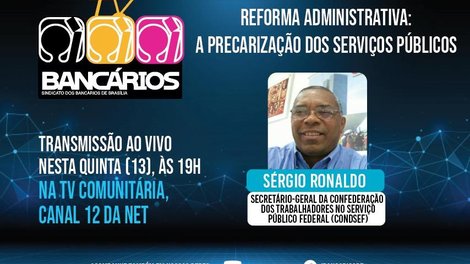 O TV Bancários desta quinta-feira (13) trata da reforma administrativa (PEC 32) enviada ao Congresso pelo governo Bolsonaro. O entrevistado do programa é Sérgio Ronaldo da Silva, secretário-geral da Confederação Nacional dos Trabalhadores no Serviço Público Federal (Condsef).