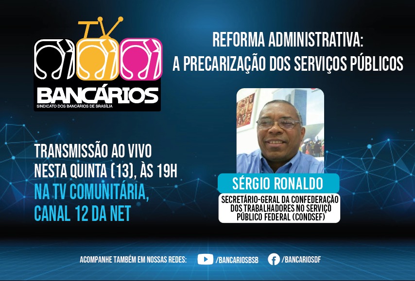 O programa TV Bancários vai ao ar às 19h, ao vivo, pela TV Comunitária (canal 12 da Net), com transmissão também pelas redes sociais do Sindicato dos Bancários de Brasília – youtube.com/bancariosbsb e facebook.com/bancariosdf.