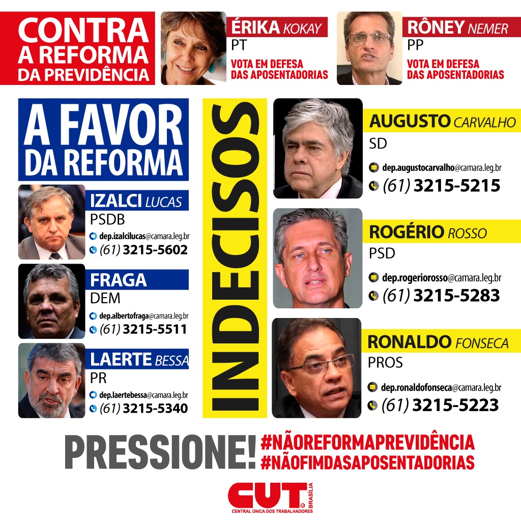 É importante que cada trabalhador e cada trabalhadora ligue, mande e-mail e mensagem para os deputados do DF, como forma de pressioná-los a votar contra o fim das aposentadorias. Veja abaixo a lista dos parlamentares do DF, sua posição quanto à reforma da Previdência, telefone e e-mail.