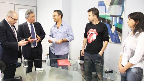 O secretário-geral do Sindicato, André Nepomuceno (centro), acompanhado de Antonio Eustáquio e Cida Sousa (à direita), também dirigentes sindicais, entregam as reivindicações aos diretores do BRB