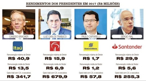 Não apenas os acionistas surfaram no lucro de R$ 57,63 bilhões de Itaú, Bradesco, Banco do Brasil e Santander em 2017. Também ganharam diretores e conselheiros, cujas rendas milionárias ficaram conhecidas nesta terça-feira 26, devido à decisão do Tribunal Regional Federal da 2ª Região (TRF2), que obrigou empresas de capital aberto a abrir as remunerações máximas e mínimas de seus executivos.