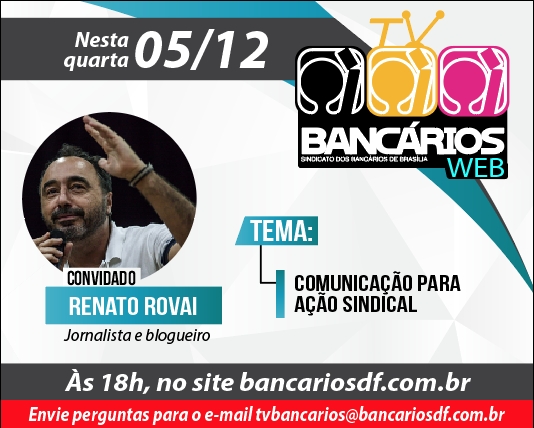 O programa TV Bancários Web apresenta nesta quarta-feira (5) um bate-papo com o jornalista e blogueiro Renato Rovai, da Revista Fórum, sobre o uso da comunicação para fortalecer a relação entre sindicatos e suas bases nos tempos atuais. Esta edição será transmitida a partir das 18h pelas redes sociais do Sindicato.