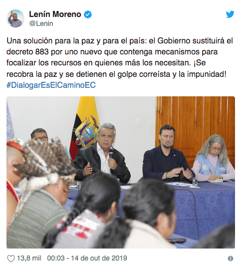 Antes do anúncio da revogação do decreto, Moreno se reuniu com o presidente da Confederação das Nacionalidades Indígenas do Equador (Conaie) Jaime Vargas, que também exigiu a demissão imediata dos ministros do Governo, Maria Paula Romo, e da Defesa, Oswaldo Jarrín, apontados como os responsáveis pela repressão. O presidente não se pronunciou sobre tal exigência e anunciou que substituirá o decreto “por um novo que contenha mecanismos para focalizar os recursos a quem mais necessitam”, o que pode ser um novo foco de disputa e instabilidade.