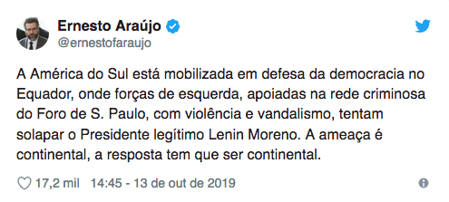 Gonçalves também classificou como “completamente inadequada e inconveniente” a posição do ministro brasileiro das Relações Exteriores, Ernesto Araújo. Pelo Twitter, ele atribuiu a crise no Equador à atuação de “forças de esquerda” que estariam tentando derrubar o presidente Moreno. “Quem respondeu a isso não foi a esquerda ou o Foro de São Paulo. Trata-se de uma fantasia que habita a cabeça delirante do ministro. O que houve foi uma reação popular contra uma medida que prejudica os interesses da população.”