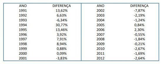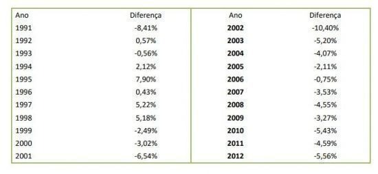 Confira as perdas/ganhos considerando a remuneração total (TR+3%) em relação ao INPC, a partir de 1991 quando a TR foi criada. Na prática o FGTS recebe, anualmente, juros de 3%.