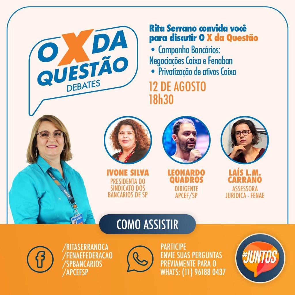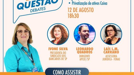 Participam de “O X da Questão - debates” a presidenta do Sindicato dos Bancários de São Paulo, Ivone Silva, o dirigente da Apcef/SP Leonardo Quadro e a assessora jurídica da Fenae Laís Carrano.