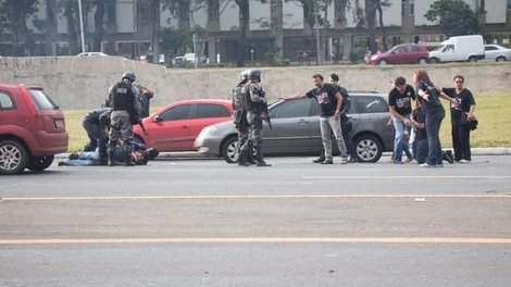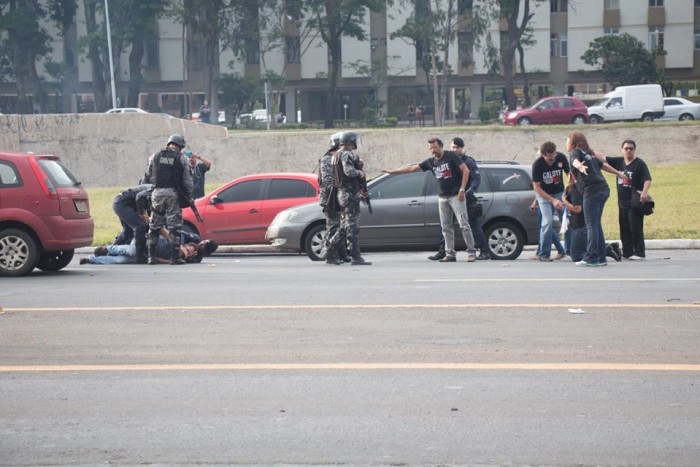 O ato da quarta-feira (28) foi realizado simultaneamente nos Eixos Norte e Sul, no final da tarde. Para conter os manifestantes, que nas mãos tinham apenas bandeiras e faixas contra o calote e o retrocesso institucionalizado por Rollemberg, os policiais miraram nos professores armas de alto calibre. Manifestantes foram jogados no chão, imobilizados pelo pescoço e agredidos física e verbalmente por uma polícia que, pelo menos naquele momento e a mando do governador, representou qualquer papel, menos o de protetor da sociedade.