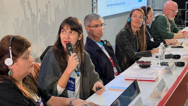 A mesa também foi composta por Veronica Nisson (TUAC), Paola Granda (CAT Peru), Jesus Gallego (UGT Espanha) e a representante da AFLCIO, dos Estados Unidos, Shawna Michele Bader-Blau, que comentou que a organização de trabalhadores de plataformas é uma forma de fortalecer o movimento sindical para combater os ataques aos direitos e, consequentemente a extrema direita.
