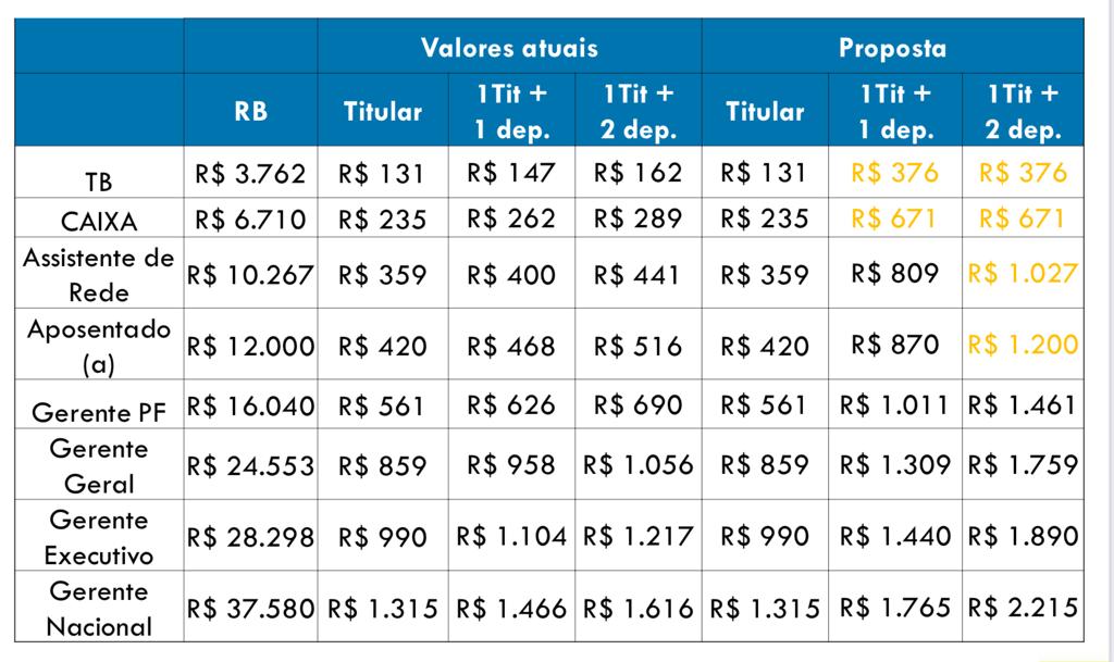 No encontro de hoje (16), a Caixa trouxe como proposta a manutenção de 3,5% da contribuição do titular, com valor fixo de R$ 450 por dependente, mas mantendo o teto de 10% da remuneração, conforme tabela abaixo. Caso essa proposta seja implementada, os dependentes passariam a arcar com 48% das despesas e os titulares com 52%.
