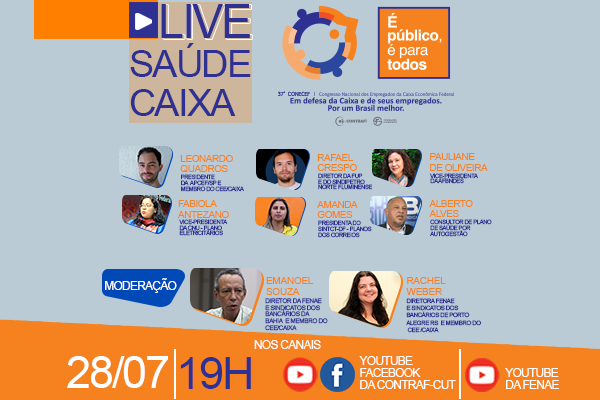 A segunda edição das lives preparatórias para o 37º Congresso Nacional dos Empregados da Caixa Econômica Federal (Conecef), terá como tema o Saúde Caixa. O debate promovido pela Comissão Executiva dos Empregados da Caixa (CEE/Caixa) com apoio da Confederação Nacional dos Trabalhadores do Ramo Financeiro da CUT (Contraf-CUT) e Federação Nacional das Associações do Pessoal da Caixa Econômica Federal (Fenae), acontece nesta quarta-feira (28), às 19h. A live será transmitida no Youtube e Facebook da Contraf-CUT e no Youtube da Fenae.