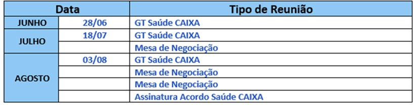 A Caixa apresentou uma proposta calendário de negociações que prevê mais duas reuniões do GT Saúde Caixa, três mesas de negociações com a CEE e a assinatura do acordo específico até o fim de agosto (veja abaixo a proposta de calendário feita pela Caixa).