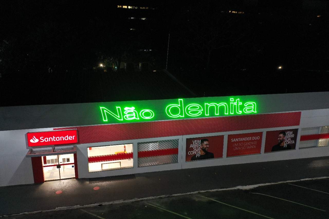 O dirigente sindical explicou que “o ato realizou-se por meio de projeções no prédio do Banco Central, na região central de Brasília, e na agência do banco da 306 Sul, com mensagens que anunciavam: “Santander, cumpra o acordo: Basta de demissões e metas abusivas!” e “Santander recebe bolsa banqueiro, mas demite 9 mil bancários. Absurdo!”
