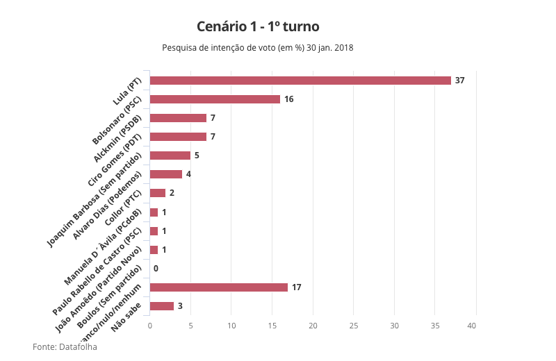 De acordo com simulações do Datafolha, esse resultado seria a resposta da maior parte dos brasileiros, alcançando 32% do total dos eleitores em cenário onde Jair Bolsonaro (PSC) lidera com 20%.