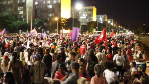 O início da noite de quarta-feira (11), marcada pela votação da admissibilidade do processo de impeachment contra a presidenta Dilma Rousseff, reuniu milhares de trabalhadores do campo e cidade, estudantes, militantes de movimentos sociais, sindicais, partidários e vários outros segmentos da sociedade civil na Esplanada dos Ministérios. Em marcha, os milhares de manifestantes repudiaram o golpe de estado em curso no Senado Federal e afirmam que continuarão nas ruas em defesa da democracia e dos direitos dos trabalhadores.