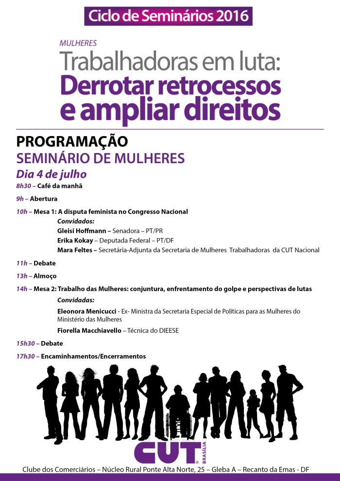 Estarão presentes a senadora Gleisi Hoffmann (PT/PR); a deputada federal Érika Kokay (PT/DF); a ex-secretária especial de Políticas para as Mulheres, Eleonora Menicucci; a técnica do Dieese Fiorella Macchiaveloo, e a secretária-adjunta nacional da Secretaria de Mulheres Trabalhadoras da CUT, Mara Feltes.