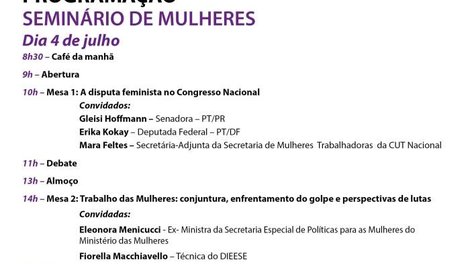 Estarão presentes a senadora Gleisi Hoffmann (PT/PR); a deputada federal Érika Kokay (PT/DF); a ex-secretária especial de Políticas para as Mulheres, Eleonora Menicucci; a técnica do Dieese Fiorella Macchiaveloo, e a secretária-adjunta nacional da Secretaria de Mulheres Trabalhadoras da CUT, Mara Feltes.