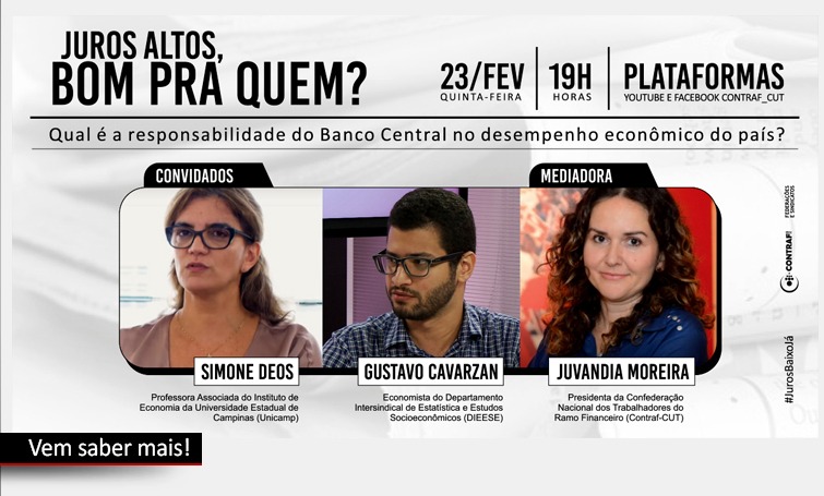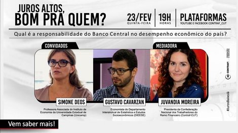 Juros altos, bom pra quem? Esse é o tema de seminário digital que será realizado na próxima quinta-feira (23), às 19h, com a participação de Simone Deos, professora Associada do Instituto de Economia da Universidade Estadual de Campinas (Unicamp), e de Gustavo Cavarzan, economista do Departamento Intersindical de Estatística e Estudos Socioeconômicos (Dieese).