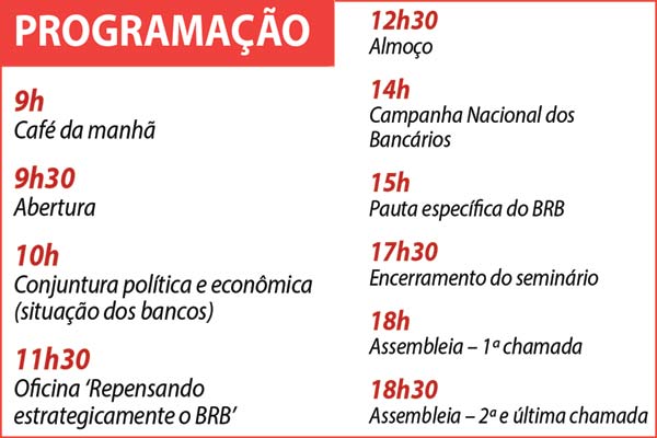 O seminário terá início às 9h, e se estenderá até as 18h. Ao final do seminário será realizada assembleia geral, que será aberta a todos os bancários do BRB, para deliberação sobre a pauta. Por ocasião da assembleia, será colocada em discussão também as alterações no encarreiramento do Plano de Cargos, Carreiras e Remuneração (PCCR), cuja discussão está praticamente finalizada com o banco. “Este é o momento de debatermos nossa pauta específica, e ainda o encaminhamento da campanha salarial no BRB. Assim como em outros anos, será uma campanha duríssima, que demanda uma mobilização intensa para prosseguirmos em nossa trajetória vitoriosa de agregar ganho real, como foi o resultado de nossas últimas 10 campanhas salariais”, afirmou o diretor do Sindicato Antonio Eustáquio, que também é bancário do BRB.