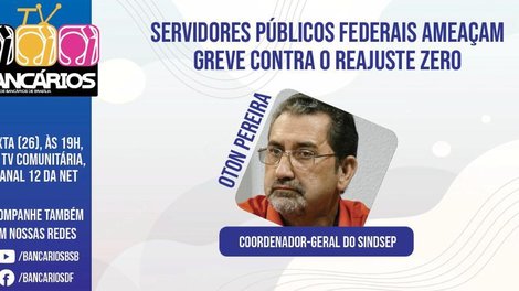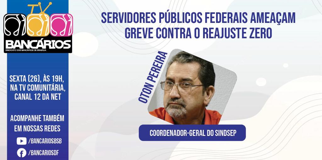 Para falar sobre o calendário de atividades dos servidores do executivo federal, o TV Bancários desta sexta (26), ao vivo, às 19h, pela TV Comunitária (canal 12 na Claro NET), e redes sociais da emissora e do Sindicato, recebe o coordenador-geral do Sindsep, Oton Pereira.