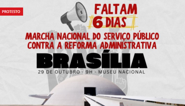 Servidores públicos de todo o país realizarão, no dia 29 de outubro (quarta-feira) a partir das 9h da manhã, no Museu Nacional da República, em Brasília, a Marcha Nacional do Serviço Público contra a Reforma Administrativa.