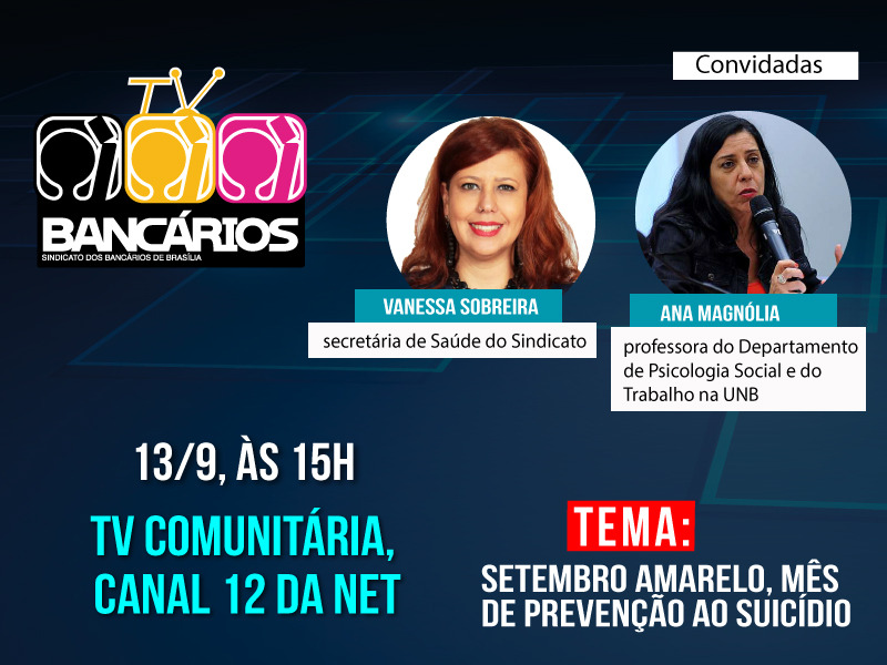 A edição desta semana do programa TV Bancários na TV Comunitária vai tratar de um tema que ainda é tabu nos tempo atuais. Em razão do Setembro Amarelo, mês dedicado à prevenção do suicídio, o programa recebe a secretária de Saúde do Sindicato, Vanessa Sobreira, e a professora do Departamento de Psicologia Social e do Trabalho na UnB, Ana Magnólia, para falar sobre o assunto. O TV Bancários vai ao ar às 15h desta sexta-feira (13) pelo Canal 12 da Net e pelas redes sociais do Sindicato.