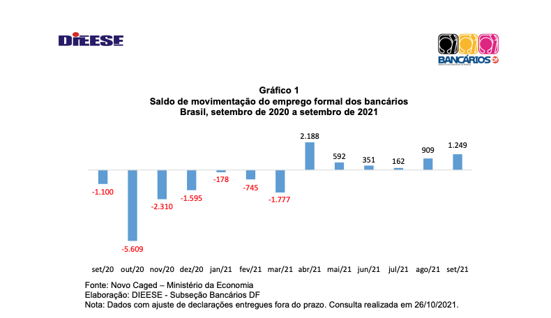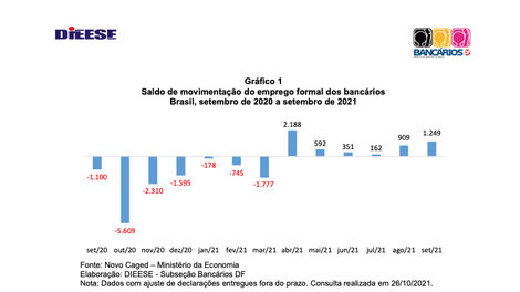 De acordo com a análise do Dieese, desde que a pandemia da Covid-19 foi declarada, em meados de março de 2020, o emprego bancário vinha sendo reduzido mês a mês no país, com exceção de maio daquele ano, quando houve saldo positivo de emprego. Desde abril de 2021, contudo, o saldo mensal voltou a ficar positivo, mas ainda num montante insuficiente para reverter o saldo negativo acumulado de setembro do ano passado a setembro de 2021. A diferença entre admissões e desligamentos, neste período, acumula saldo negativo de 7.863 postos no Brasil.