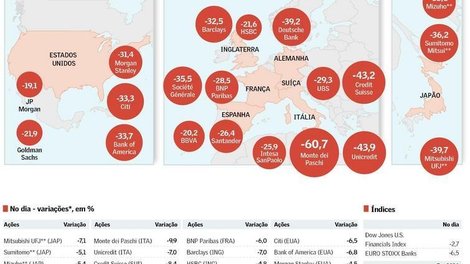 O banco grego Eurobank Ergasias SA e o italiano Unione di Banche Italiane SpA também estiveram entre os destaques de perdas, com desvalorizações superiores a 13%. Em Wall Street, os gigantes do setor financeiro Goldman Sachs e J.P. Morgan caíram 4,50%, cada.