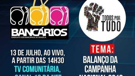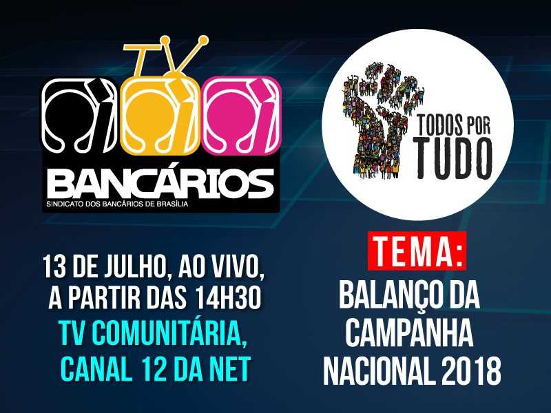 Depois de uma semana de negociações gerais, com a federação dos bancos, e específicas, com o Banco do Brasil, a Caixa e o BRB, o programa TV Bancários na TV Comunitária desta sexta-feira (13) apresentará um balanço da Campanha Nacional 2018. Esta edição será transmitida ao vivo, a partir das 14h30, pelo Facebook do Sindicato e pelo Canal 12 da Net.