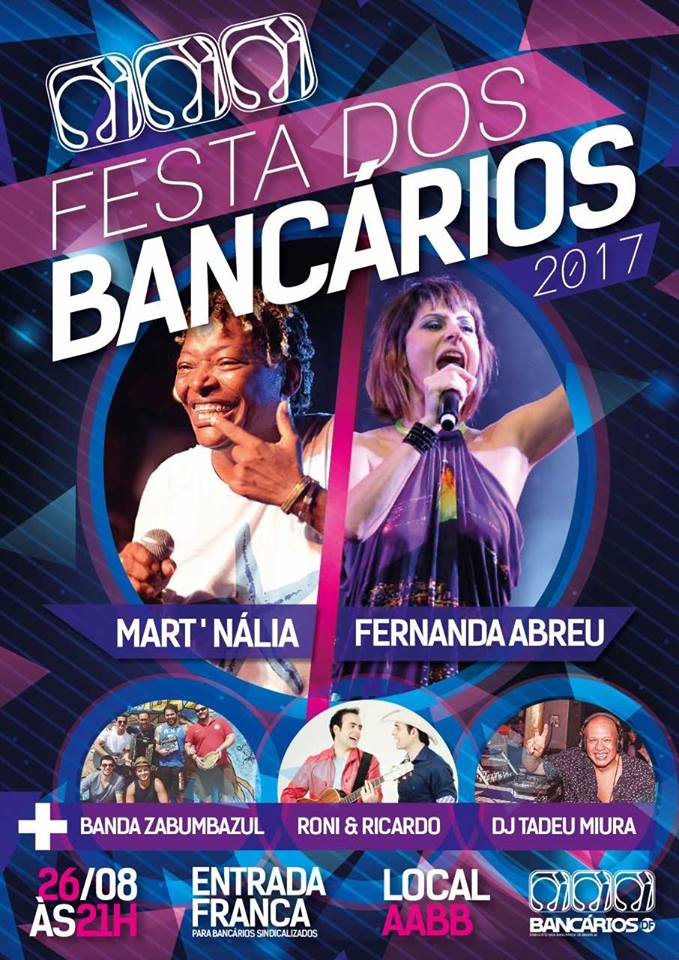 As atrações da Festa dos Bancários 2017 são as cariocas Fernanda Abreu e Mart’nália, além de apresentação da banda de forró Zabumbazul, a dupla sertaneja Roni e Ricardo e um espaço flashback, sob o comando do DJ Tadeu Miura. O grande evento começará às 21h, na AABB.