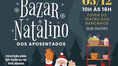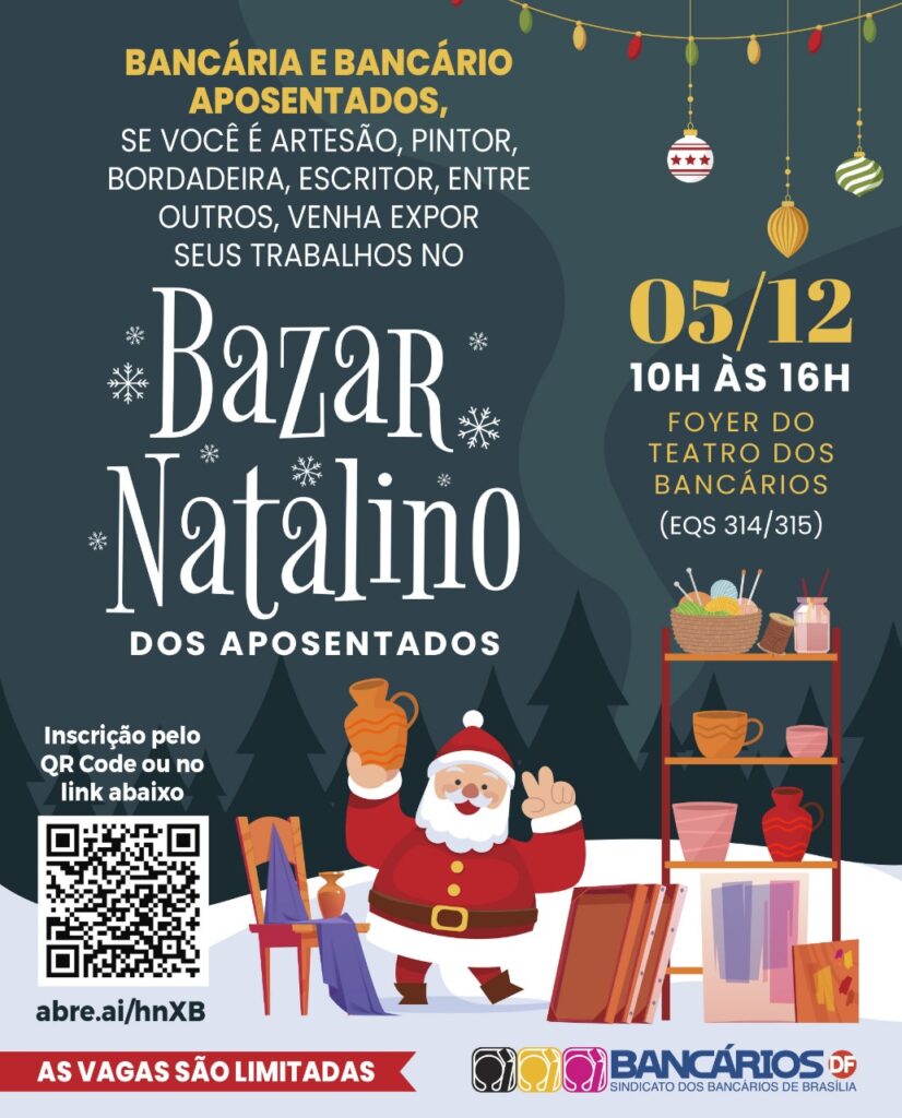 Bancária e bancário aposentado, se você é artesão, pintor, bordadeira, escritor, entre outros, venha expor seus trabalhos no Bazar Natalino dos Aposentados que o Sindicato vai realizar, no dia 5, das 10h às 16h, no foyer de sua sede (EQS 314/315). Toda a estrutura será de responsabilidade da entidade sindical.