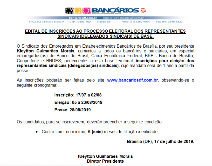 Para se candidatar, basta acessar o link. O prazo vai até o dia 2 de agosto. As eleições ocorrem do dia 5 a 23. A posse está marcada para o dia 28 do mesmo mês. Somente sindicalizados há pelo menos 6 meses podem se candidatar, mas a votação é aberta a todos os bancários.