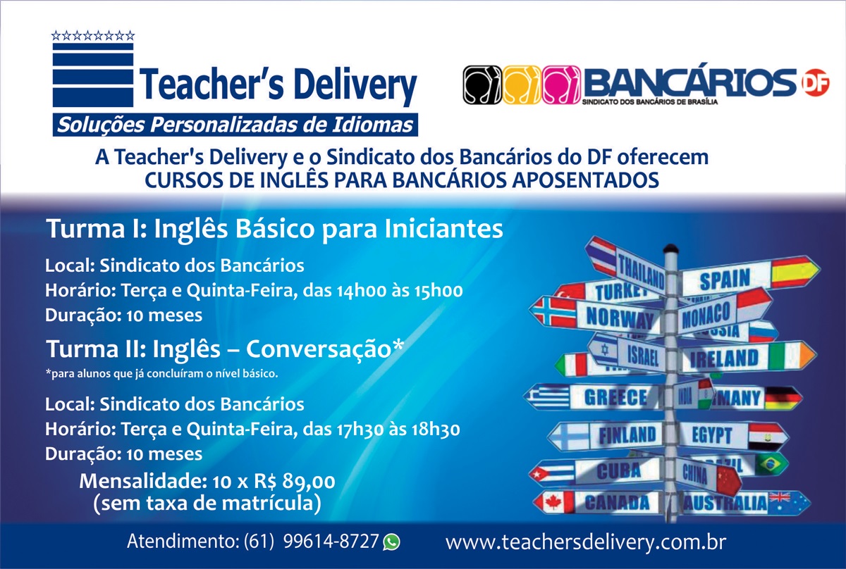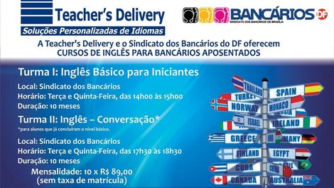 Estão abertas as inscrições para as novas turmas do curso de inglês oferecido pelo Sindicato aos bancários aposentados. O curso, que tem duração de 10 meses, acontecerá na sede da entidade (EQS 314/315), sempre às terças e quintas-feiras.