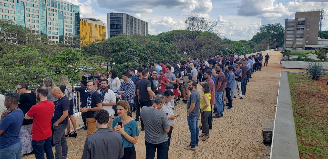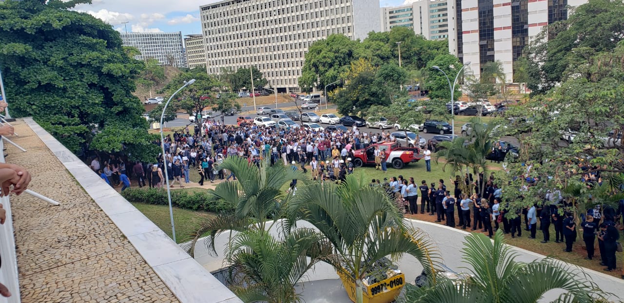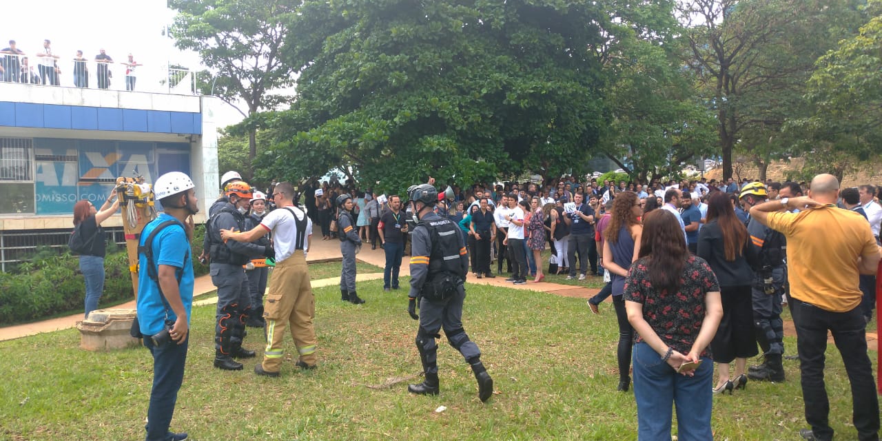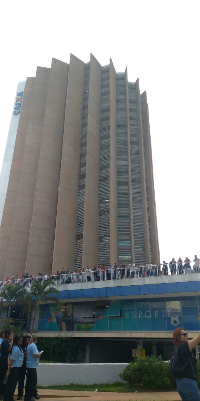 Os empregados do Edifício Matriz I da Caixa participaram na tarde desta sexta-feira (25) de exercício de desocupação do prédio, em simulação de situação de risco à segurança por comprometimento da edificação, incêndio ou outras ocorrências.
