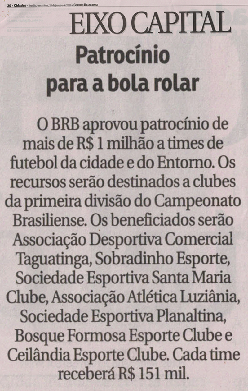 Economia em substituições e gastos supérfluos em patrocíniosO banco, conforme notícia veiculada no Correio Braziliense de 26 de janeiro, na coluna Eixo Capital, aportará, em forma de patrocínio a diversos clubes de futebol do DF e Entorno, R$ 1.000.000 (um milhão de reais). Nada contra o esporte, cujo patrocínio do conglomerado BRB ao time de basquete Uniceub representa um investimento com retorno certo, mas os clubes citados na matéria são quase na totalidade desconhecidos até no DF, talvez no Brasil, e pelo que consta, não estão inscritos em nenhum dos campeonatos brasileiros, nem da quarta divisão. Daí se questionar este “investimento”, cujo retorno é absolutamente incerto. O questionamento se torna mais cabível diante da argumentação do banco, de que a suspensão de substituições decorre da necessidade de austeridade na gestão, o que impõe a necessidade de economia de guerra.
