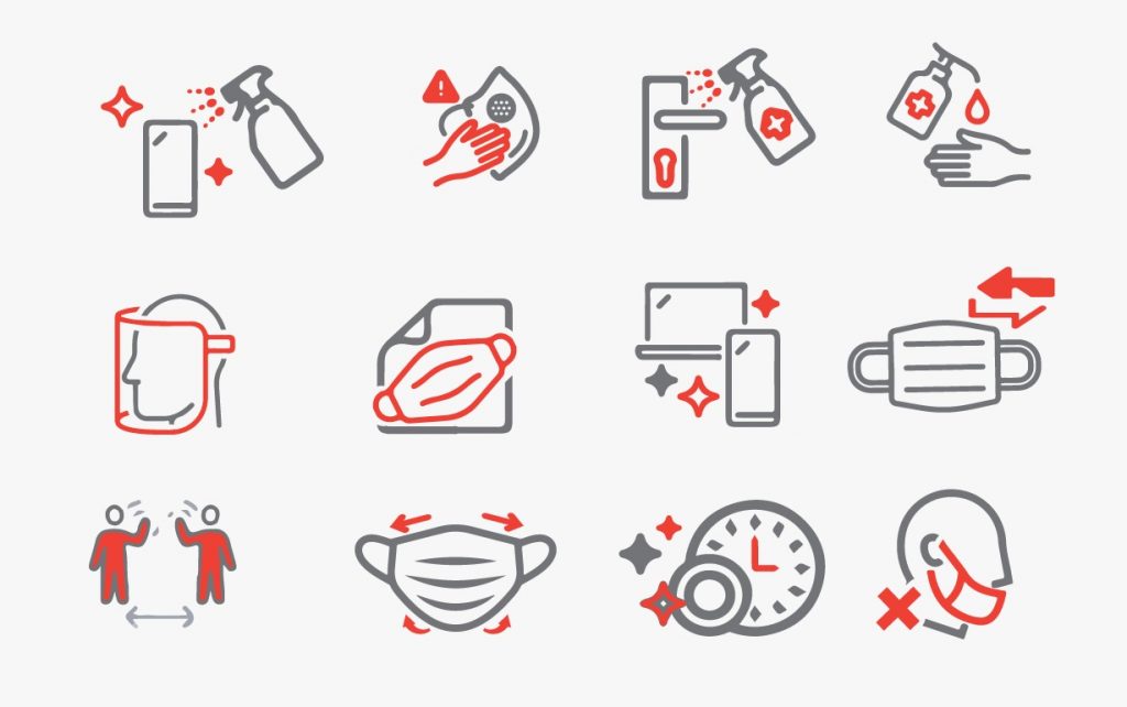- Uso de máscaras de pano cobrindo boca e nariz, bem ajustada ao rosto para não ter frestas nas laterais, do tamanho adequado, com fitas de amarração ou elástico. Se possível com duas camadas de tecido grosso de trama firme