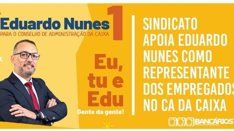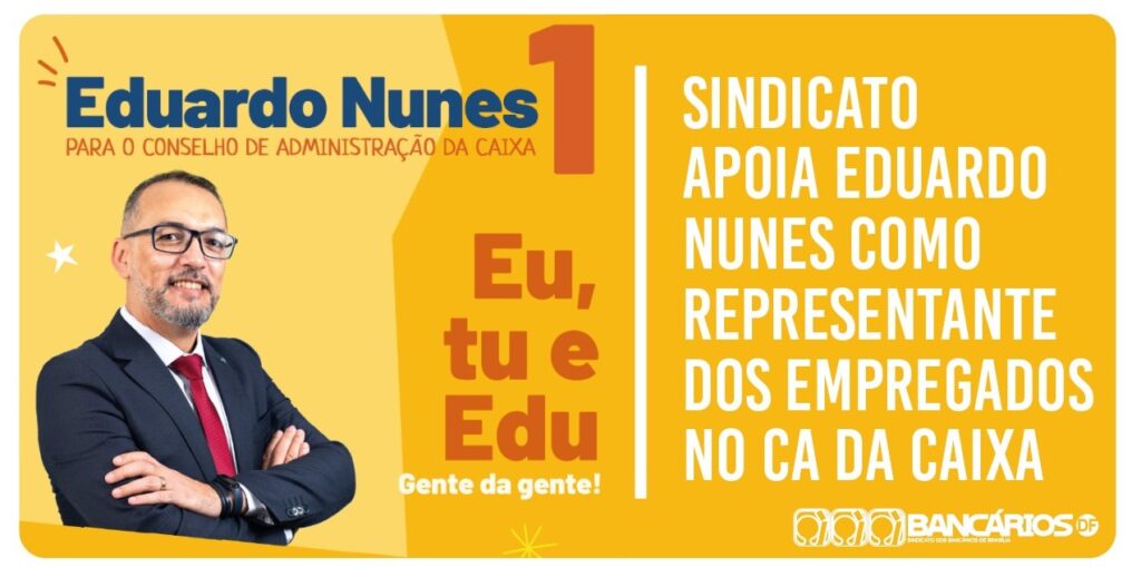 O Sindicato dos Bancários de Brasília manifesta o seu apoio à candidatura de Eduardo Nunes como representante dos empregados no Conselho de Administração da Caixa Econômica Federal. A eleição será de 24 a 27 de abril, de forma virtual, pelo sistema do banco. Todos os empregados da ativa podem votar, inclusive em férias ou em licença.