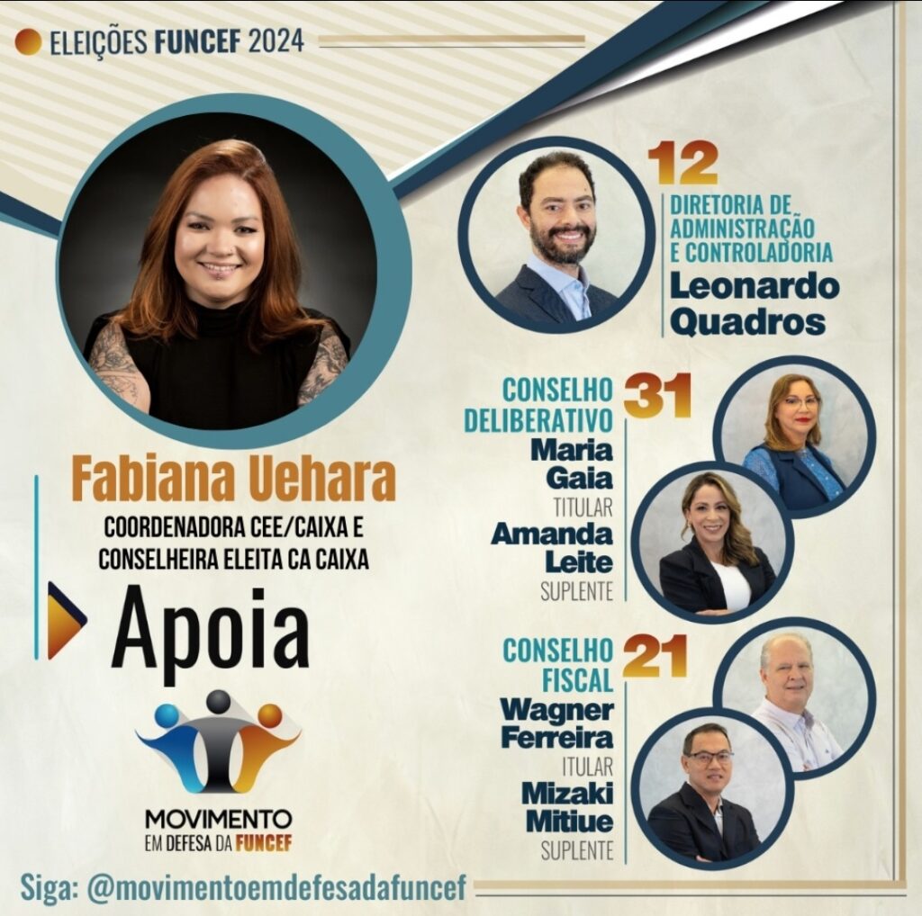 Coordenadora da Comissão Executiva dos Empregados da Caixa (CEE/Caixa) e conselheira de Administração eleita da Caixa, Fabiana Uehara apoia e recomenda o voto nos integrantes do Movimento em Defesa da Funcef, “pois são pessoas que eu conheço, são íntegras e compromissadas na defesa dos participantes e da própria Fundação”.