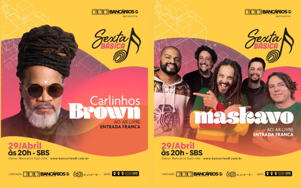 Chegou a hora de escrever novas linhas na história do inesquecível Sexta Básica. Para celebrar o Dia do Trabalhador, 1º de Maio, o Sindicato retoma o tradicional projeto de arte, cultura e entretenimento com duas atrações imperdíveis: o baiano Carlinhos Brown e a banda brasiliense Maskavo. Sexta (29), a partir das 20h, vai ter reggae e muito axé de graça no Setor Bancário Sul. O evento também faz parte das comemorações dos 60 anos do Sindicato.
